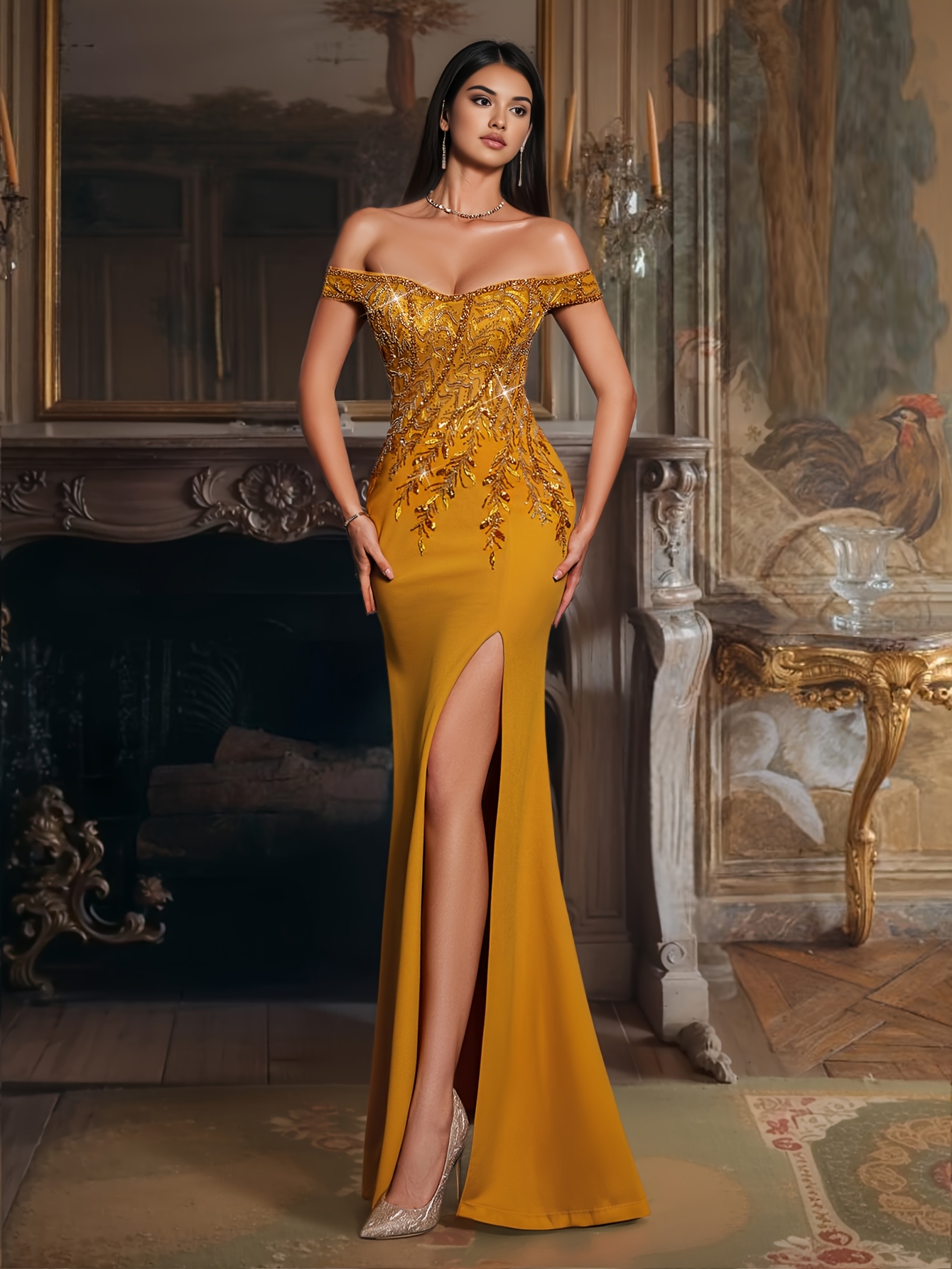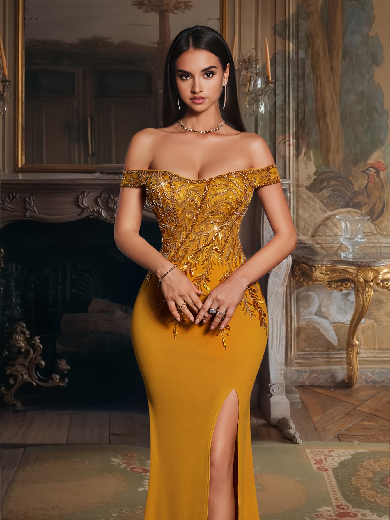 [Elegant Sequin Gown] Glamorous Elegant Off-Shoulder Sequin Gown for Women | Bodycon Mermaid Tail with High Slit, Long Formal Party Dress for Weddings, Galas & Evening Events, Solid Color Evening Wear