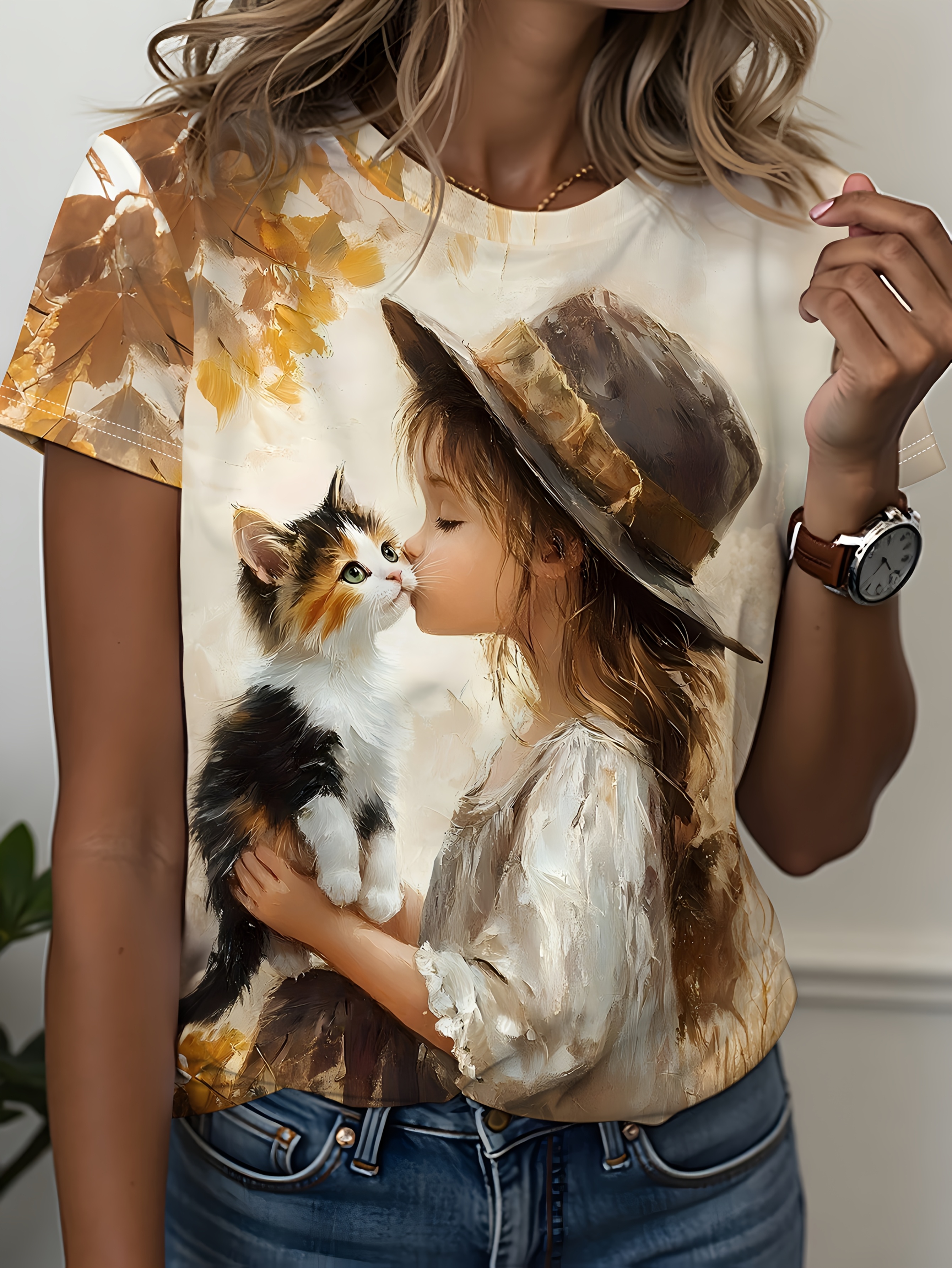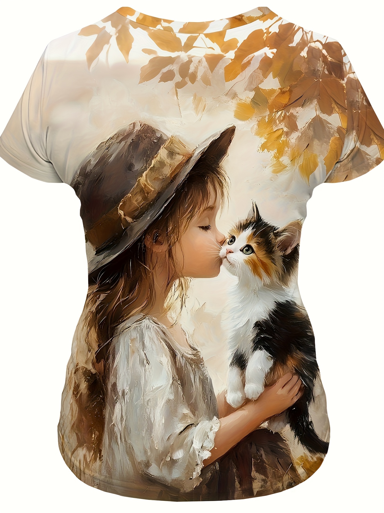 [Cozy Owl & Cat Tee] Soft & Cozy Women's Owl & Cat Print T-Shirt | Autumn Maple Leaves Design, Round Neck Casual Top for Fall Fashion, Comfortable Casual Wear