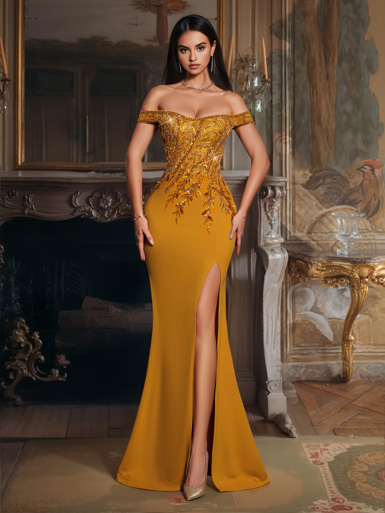 [Elegant Sequin Gown] Glamorous Elegant Off-Shoulder Sequin Gown for Women | Bodycon Mermaid Tail with High Slit, Long Formal Party Dress for Weddings, Galas & Evening Events, Solid Color Evening Wear