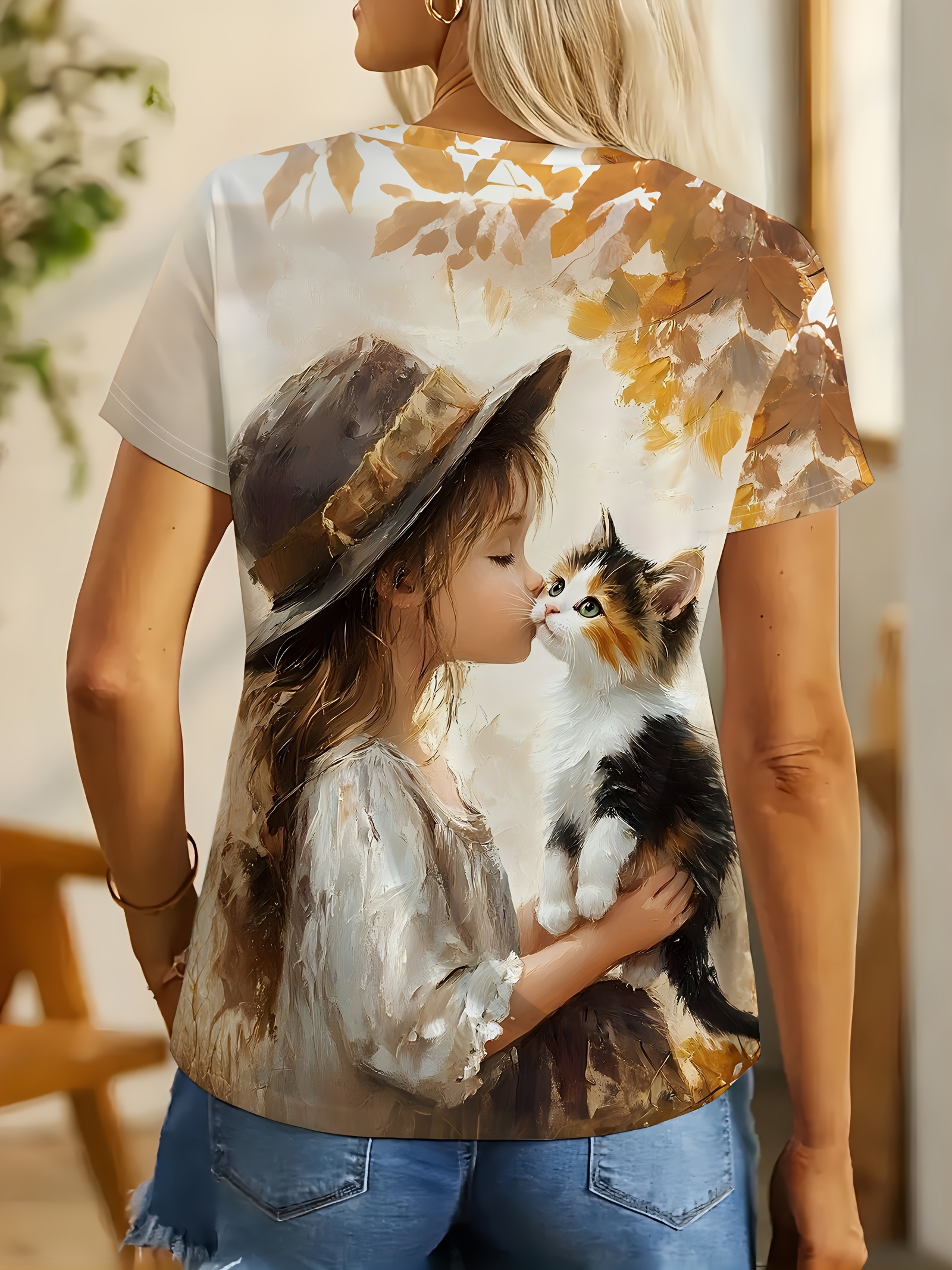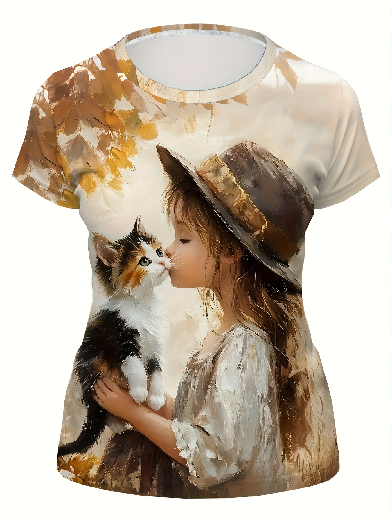 [Cozy Owl & Cat Tee] Soft & Cozy Women's Owl & Cat Print T-Shirt | Autumn Maple Leaves Design, Round Neck Casual Top for Fall Fashion, Comfortable Casual Wear