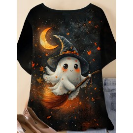Plus Size - Women'S Plus Size Halloween Ghost Print T-Shirt - Cute Witch Hat & Broom Design, Breathable Polyester Blend, Round Neck Short Sleeve Top, Machine Washable Casual Summer Outfit, Lightweight & Comfortable for Casual Attire, Halloween Shirts