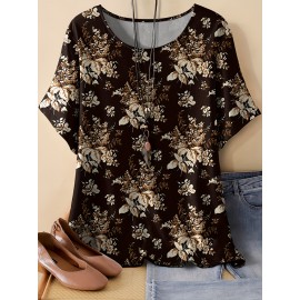 Plus Size, Oriented Plus Size Retro Multicolor Floral Print T-Shirt with Round Neck, Casual Spring/Summer Short Sleeve Top for Women - No Accessories Included