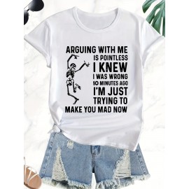 Plus Size - Women'S Plus Size Casual T-Shirt with Humorous Skeleton Quote - "Arguing with Me is Pointless, I Know I Was Wrong" Print, Soft & Comfortable Round Neck Short Sleeve Top for Spring/Summer, Ladies T Shirts