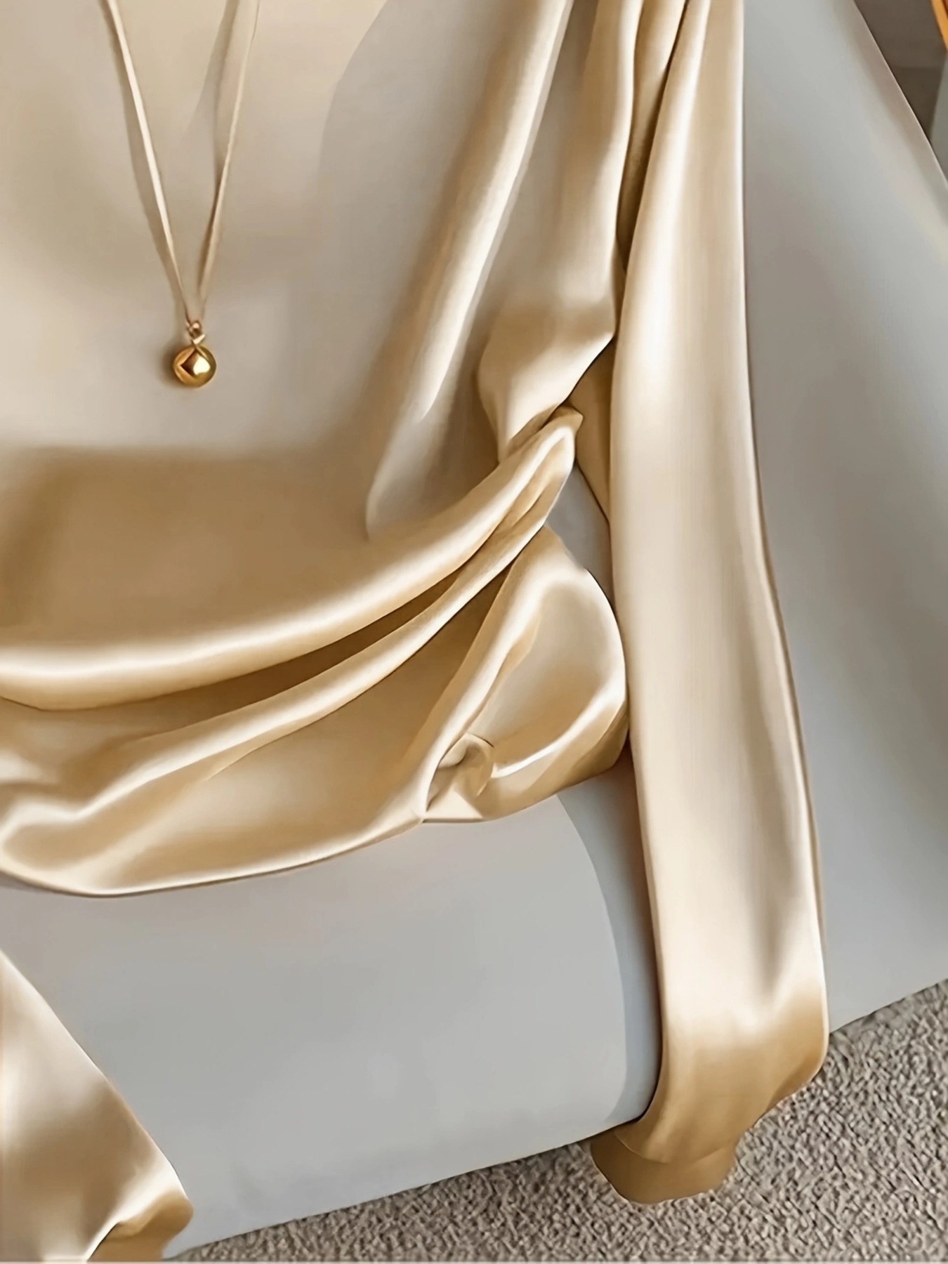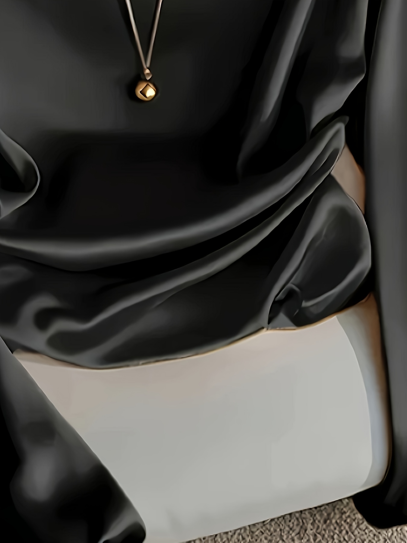 Plus Size - Elegant Plus Size Satin Blouse for Women - Long Sleeve, Off-Shoulder Design, Solid Black, Smooth Polyester Fabric, Perfect for Spring & Fall, Stylish Office Attire, Versatile Blouse | Offshoulder Top | Glossy Texture