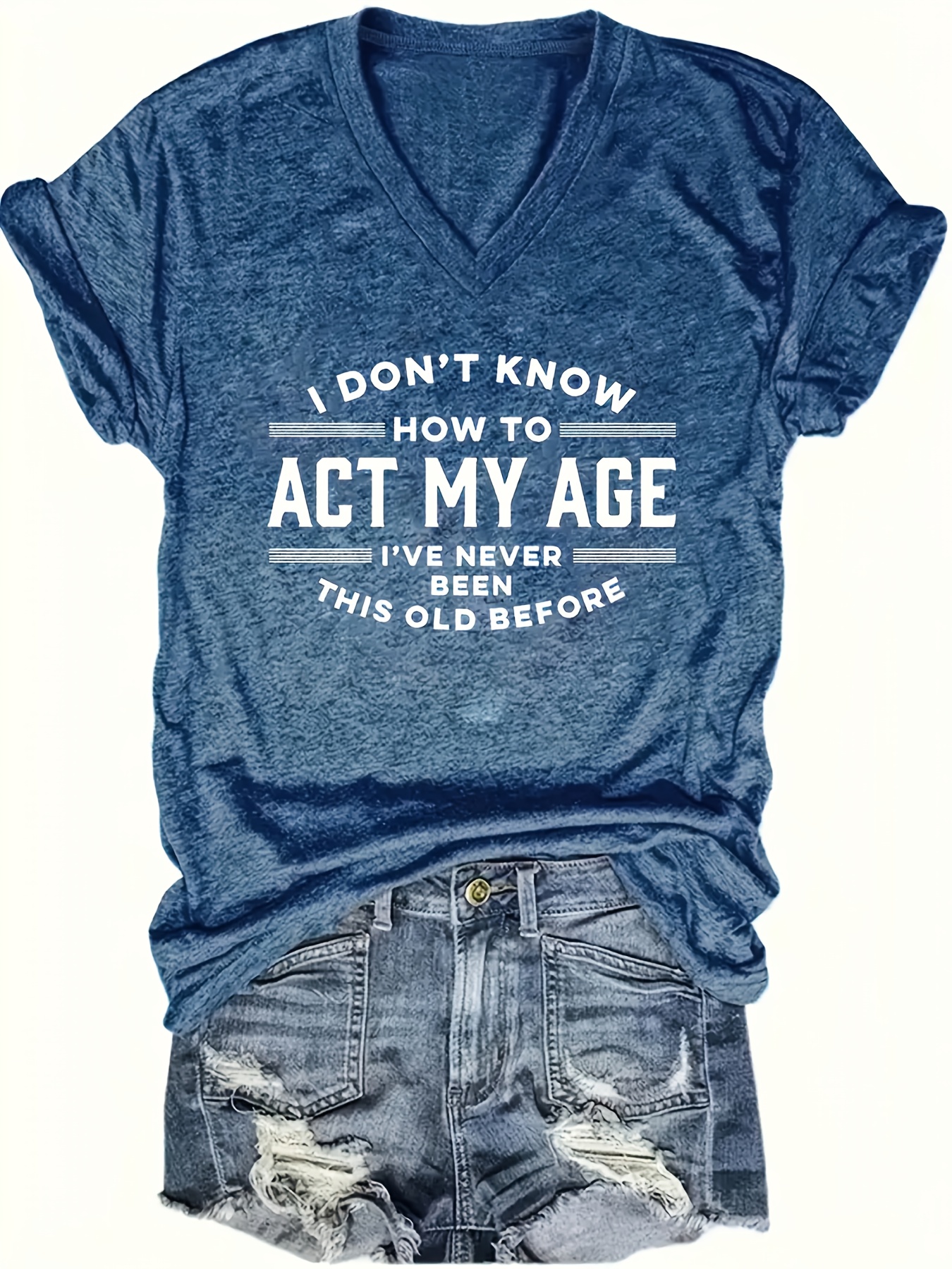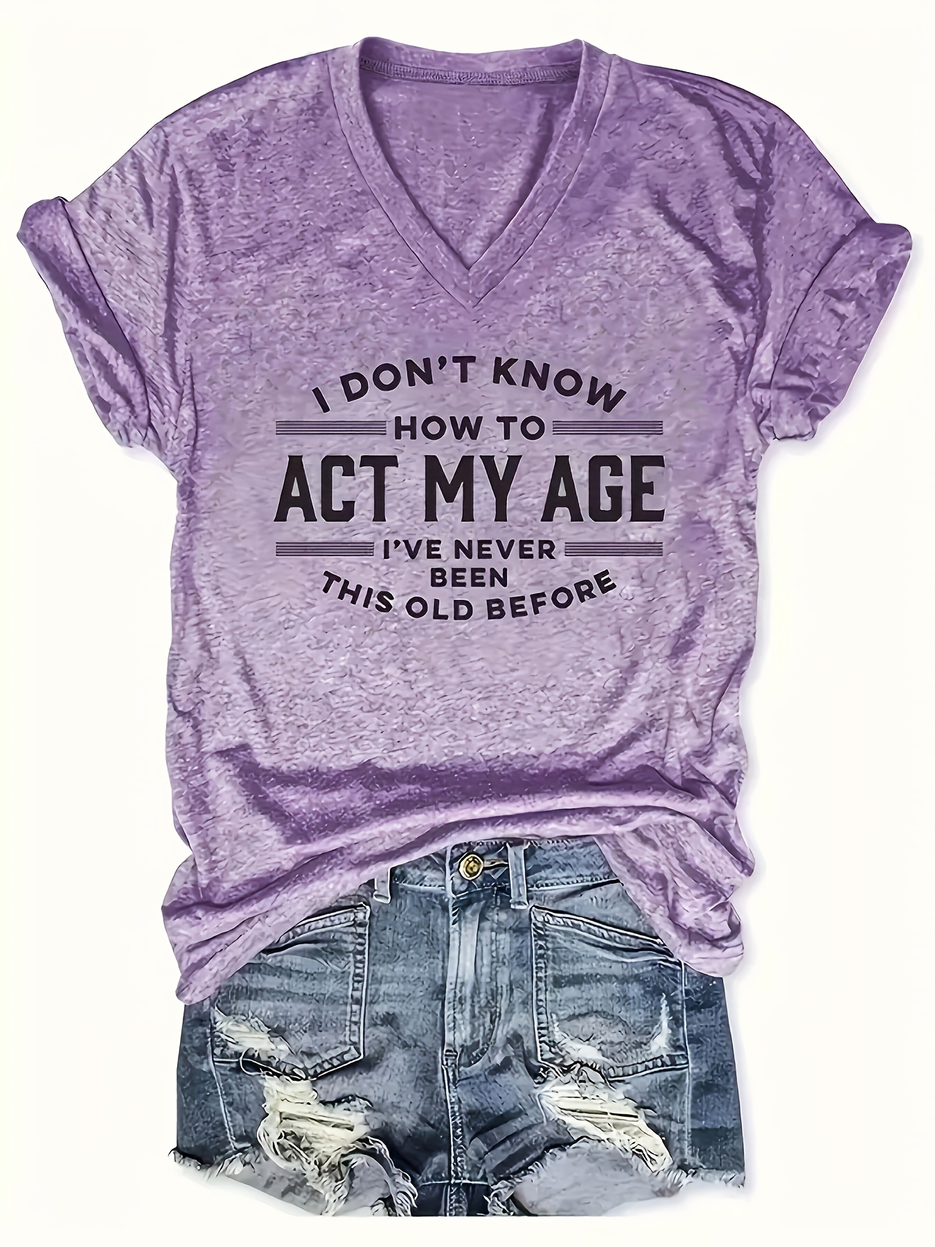 [Purple, Casual T-Shirt] Light Purple Relaxed Fit Women's Casual V-Neck Short Sleeve T-Shirt | Bold "I Don't Know How to Act My Age" Slogan Print | Machine Washable Summer Top