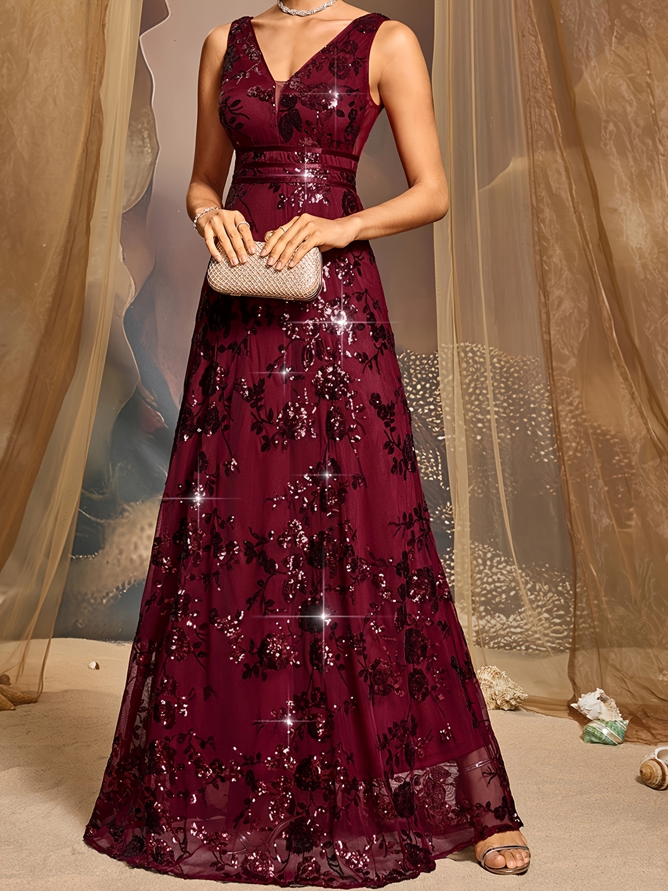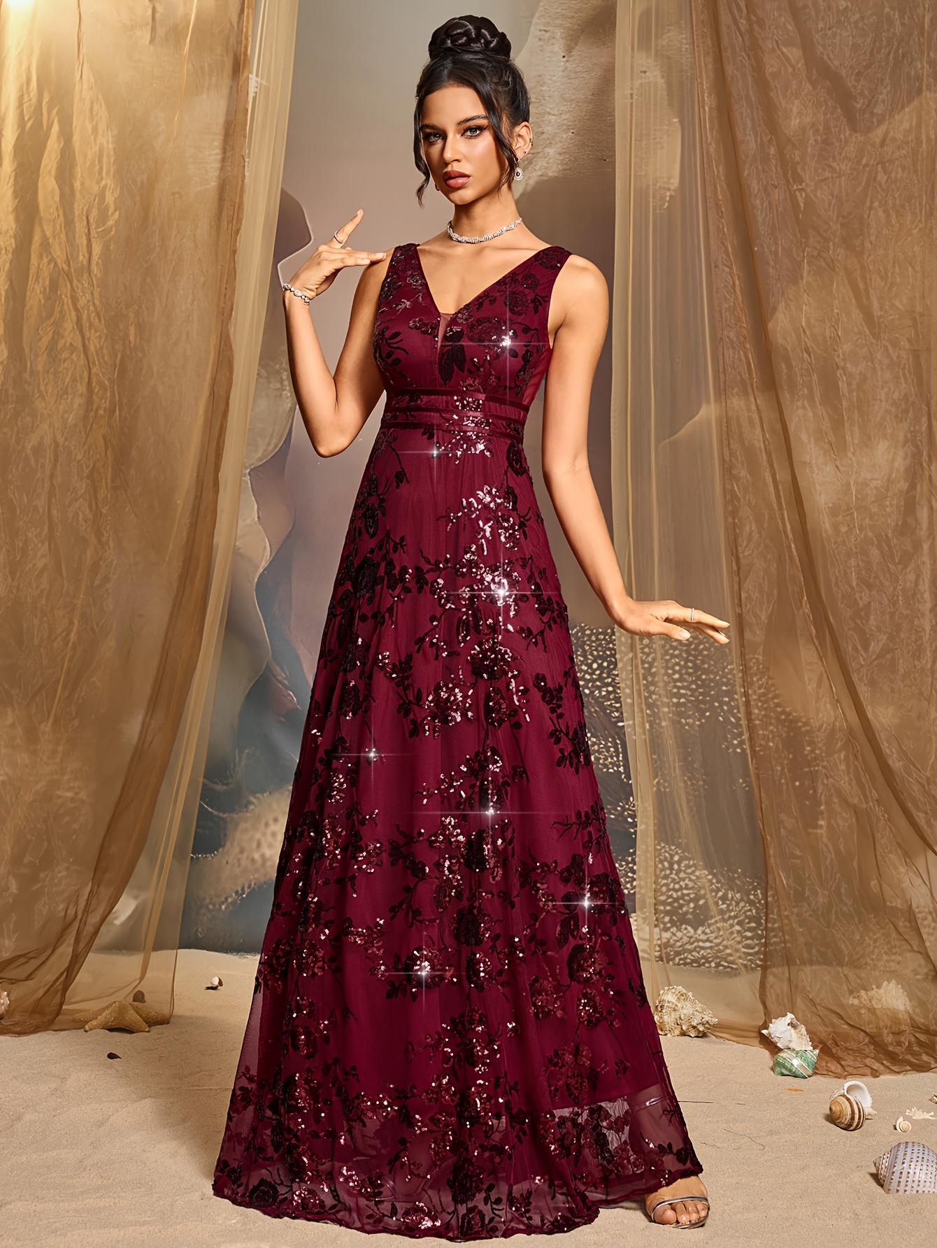 Elegant Wine Red Sequin V-Neck Gown for Women - Waist, Long Evening Dress for Parties, Banquets, and Formal Events, Perfect for Graduations and Cocktail Parties, Elegant Event Attire | Vneck Design | Shimmering Sequins
