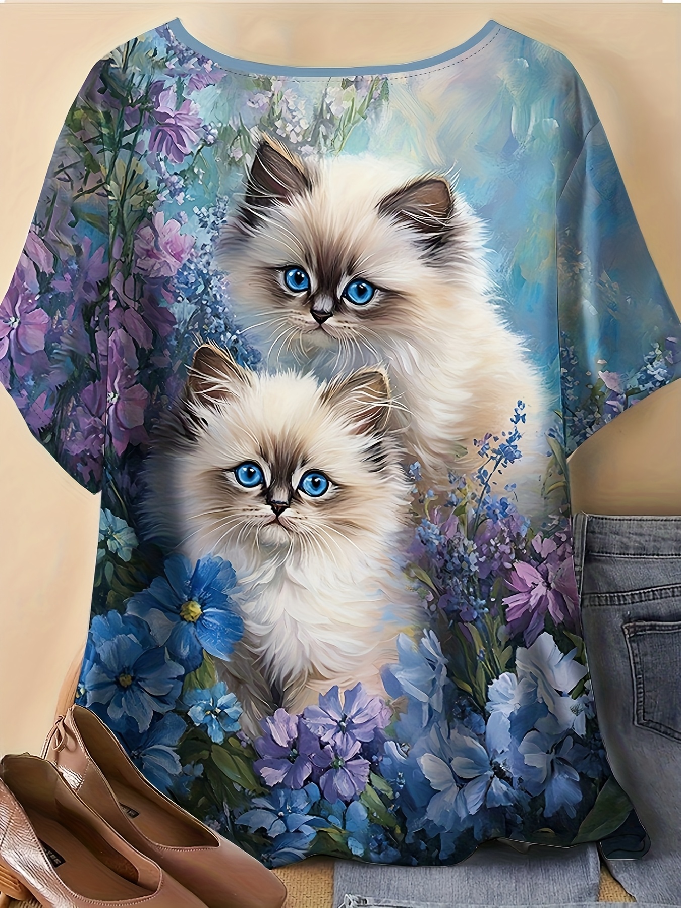 [Plus Size Floral Cat T-Shirt] Plus Size Women's 3D Floral & Cat Print T-Shirt - Stretchy Round Neck Short Sleeve Summer Top, Machine Washable Casual Elegant Outdoor Wear