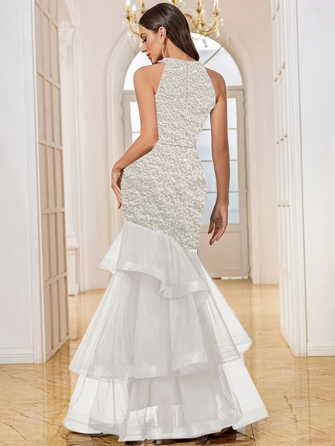 Sequin Open Back Mesh Layered Evening Gown, Elegant Women'S Party Dress for Weddings, Graduations, and Formal Dinners with Slight Stretch Fit Mermaid Skirt
