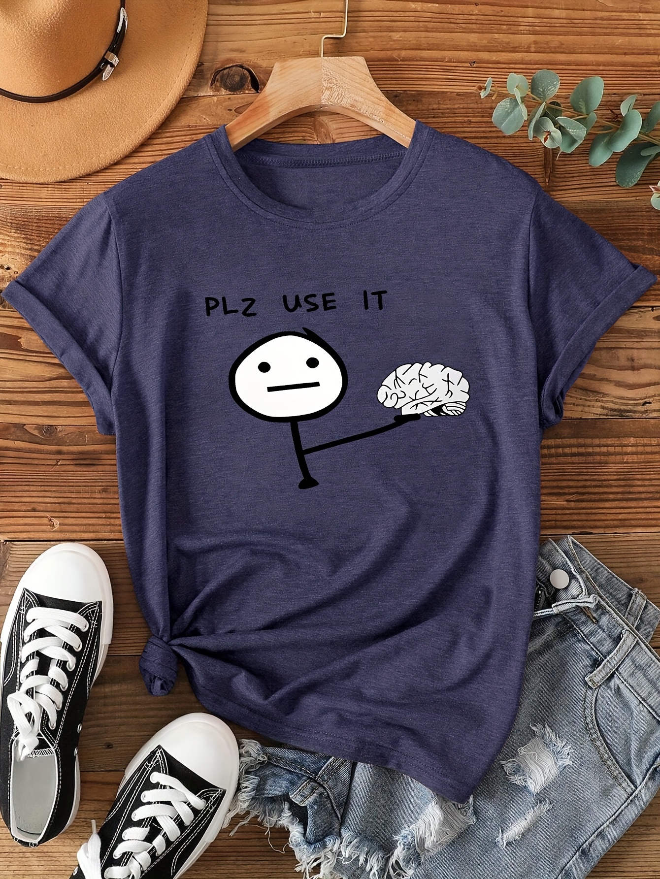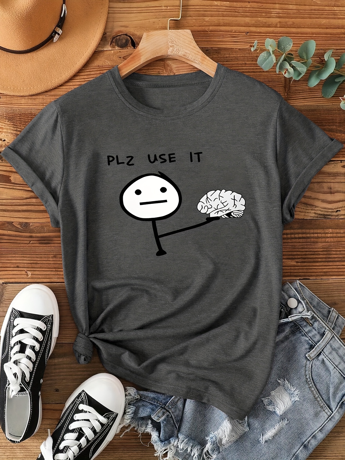 [Graphic Print Tee] Soft Stretch Women's Casual Short Sleeve T-Shirt with "PLZ USE IT" & Empty Brain Graphic Print | Machine Washable, All-Season Comfort, Sizes S-XXL in Multiple Colors