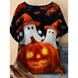 Plus Size - Women'S Plus Size Halloween Ghost Print T-Shirt - Cute Witch Hat & Broom Design, Breathable Polyester Blend, Round Neck Short Sleeve Top, Machine Washable Casual Summer Outfit, Lightweight & Comfortable for Casual Attire, Halloween Shirts
