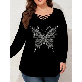 Elegant Plus Size Women's Rhinestone Butterfly Top • V-Neck Cross Strap Long Sleeves • Formal Party & Everyday Chic Blouse • Machine Washable Winter Clothing