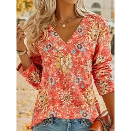 Plus Size, Plus Size Women's Elegant V-Neck Long Sleeve T-Shirt - All-Over Floral Print, Stretchy Mid-Weight Fabric, Machine Washable, Autumn Winter Casual & Formal Tops