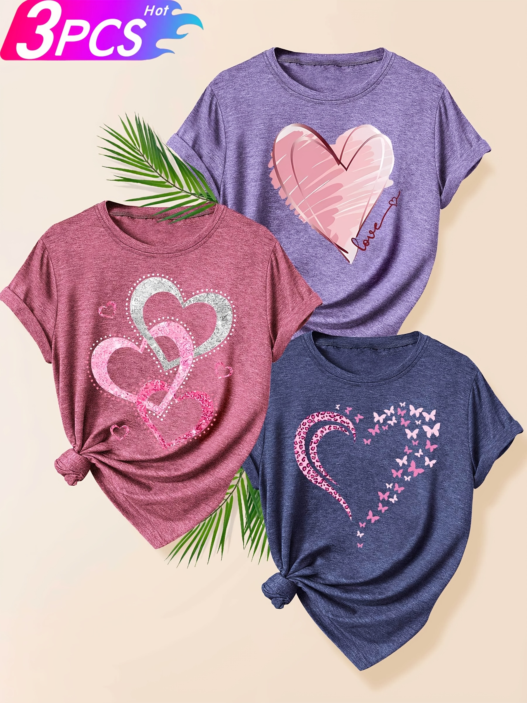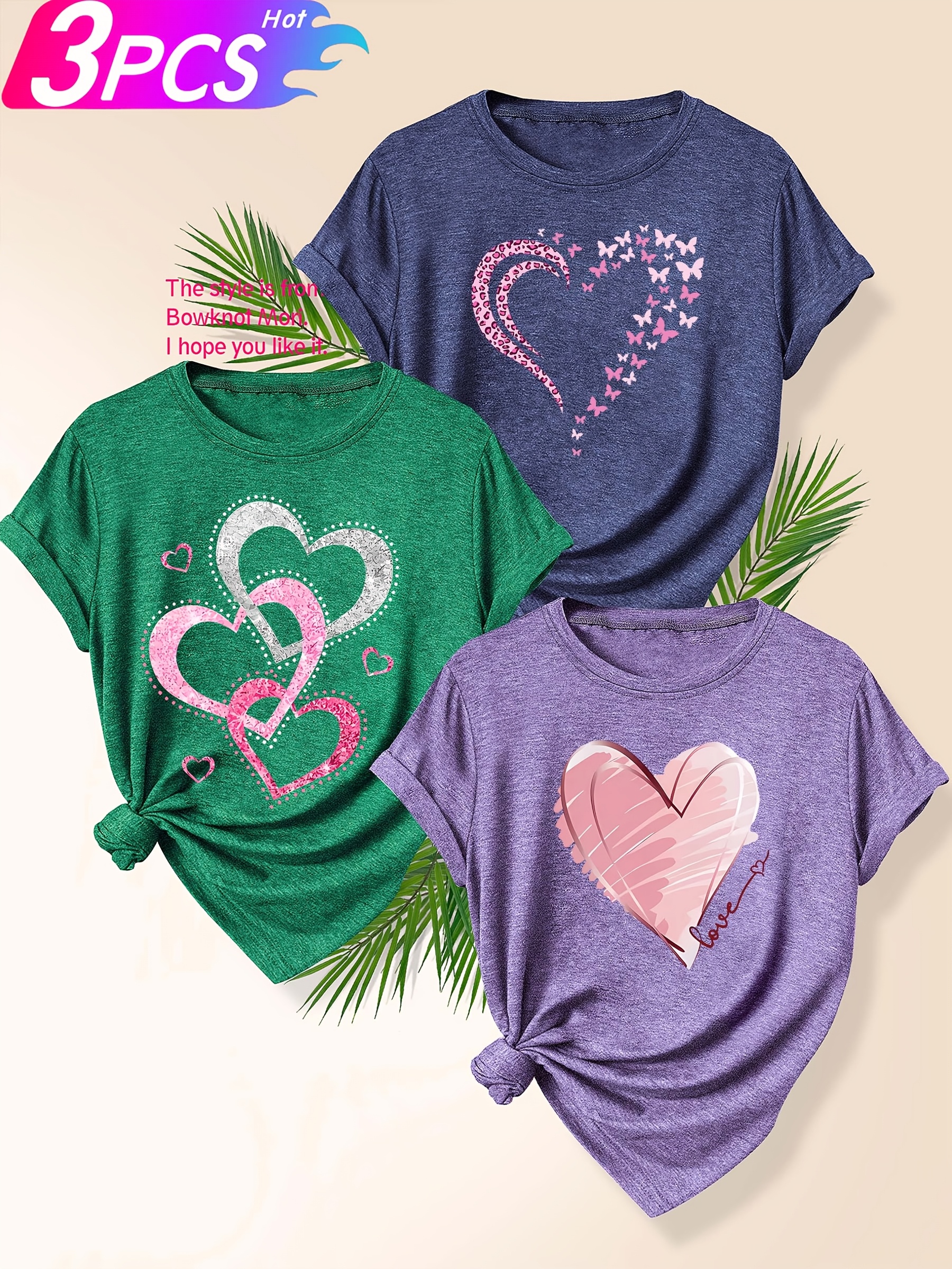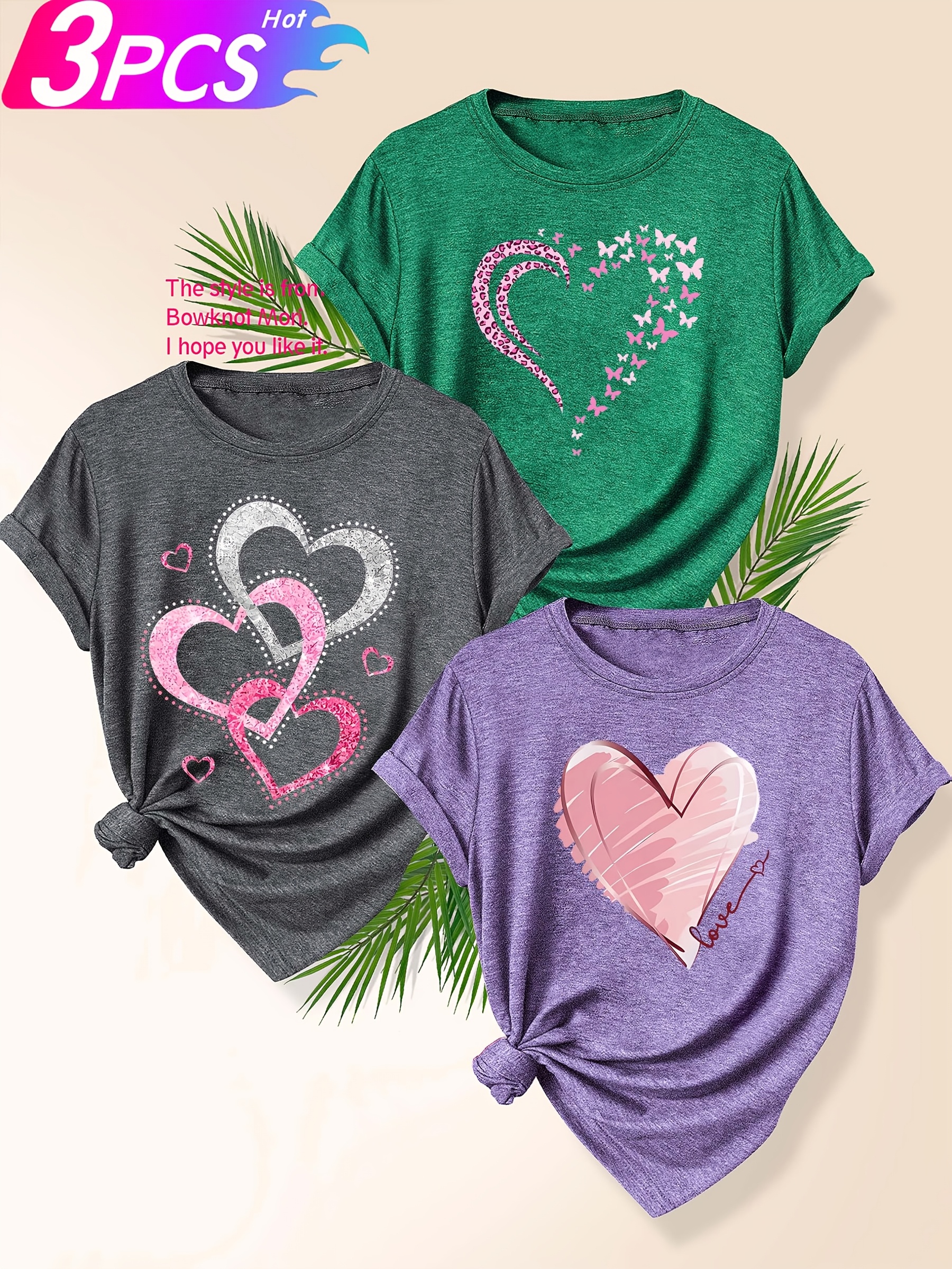 [Cute Heart T-Shirts] 3pcs Women's Heart Graphic T-Shirts | Casual Crew Neck Short Sleeve Tops with "There's Nothing Like a Good Love" & "I Hope You Like This" Designs, Multiple Colors Available for Family, Friends, or Sister Outfits