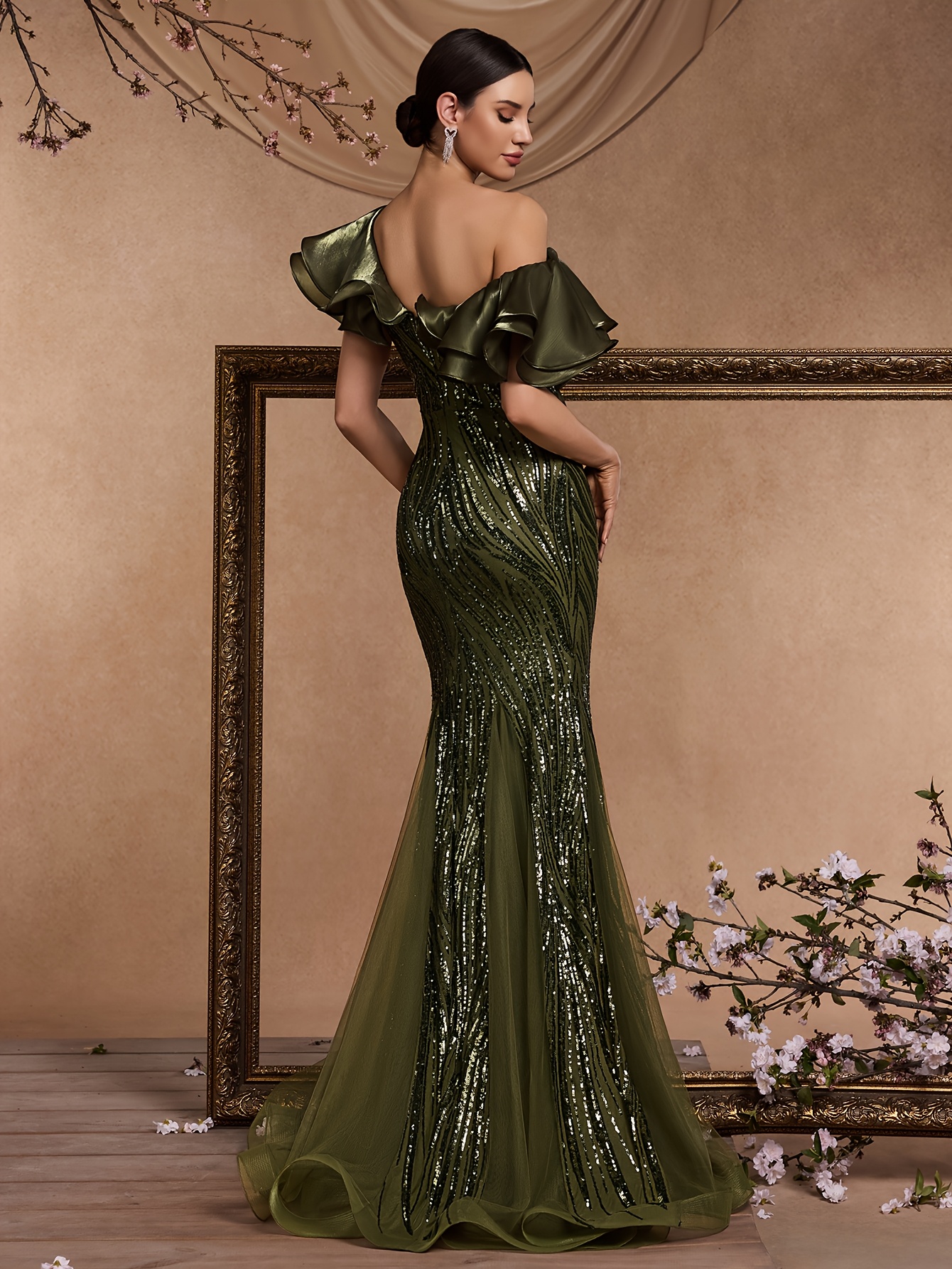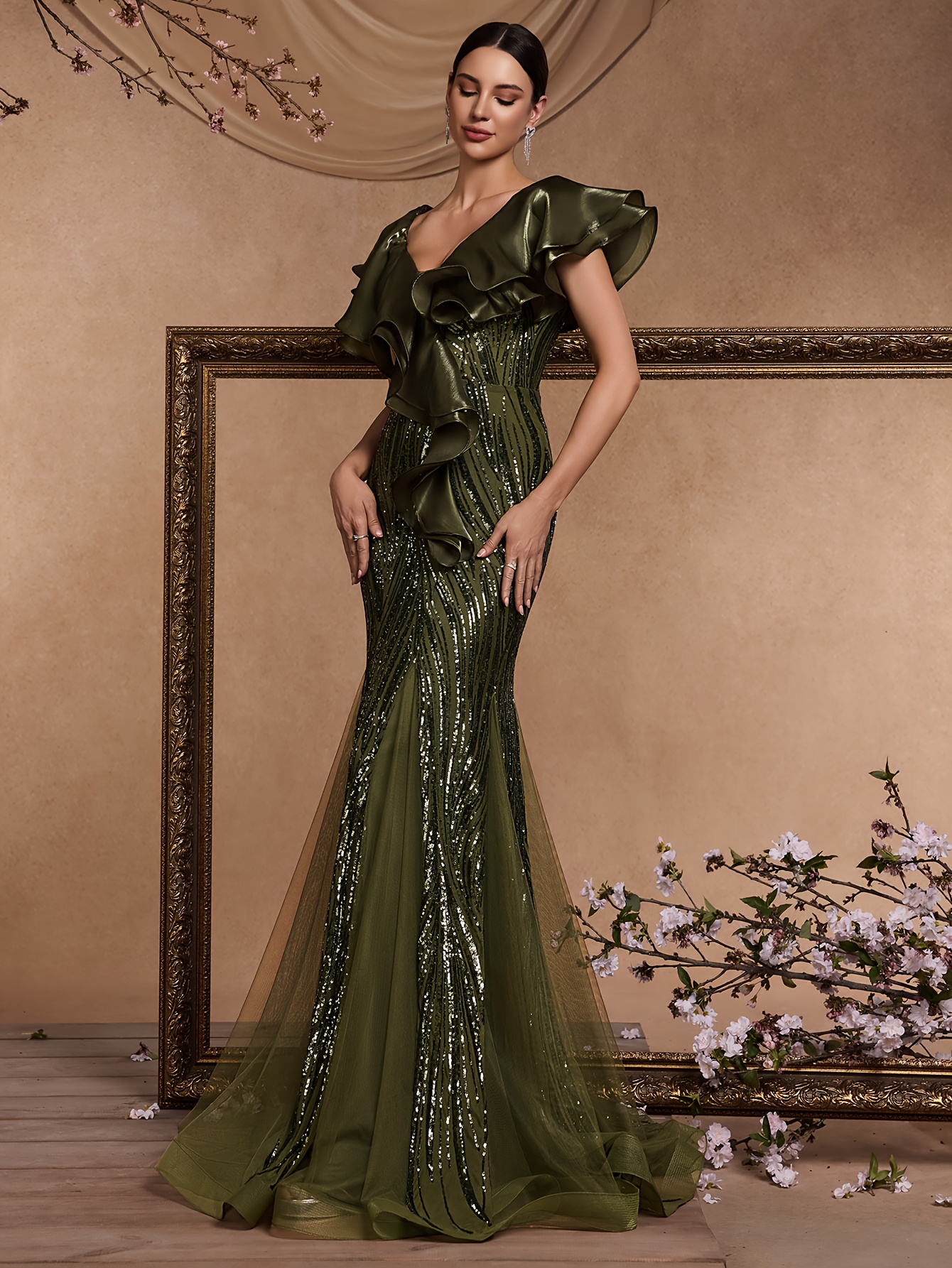 [Elegant Mermaid Gown] Form-Fitting Mermaid Gown | Elegant Deep V-Neck Sequin Evening Dress with Ruffle Sleeves and Geometric Pattern, Perfect for Weddings and Formal Events