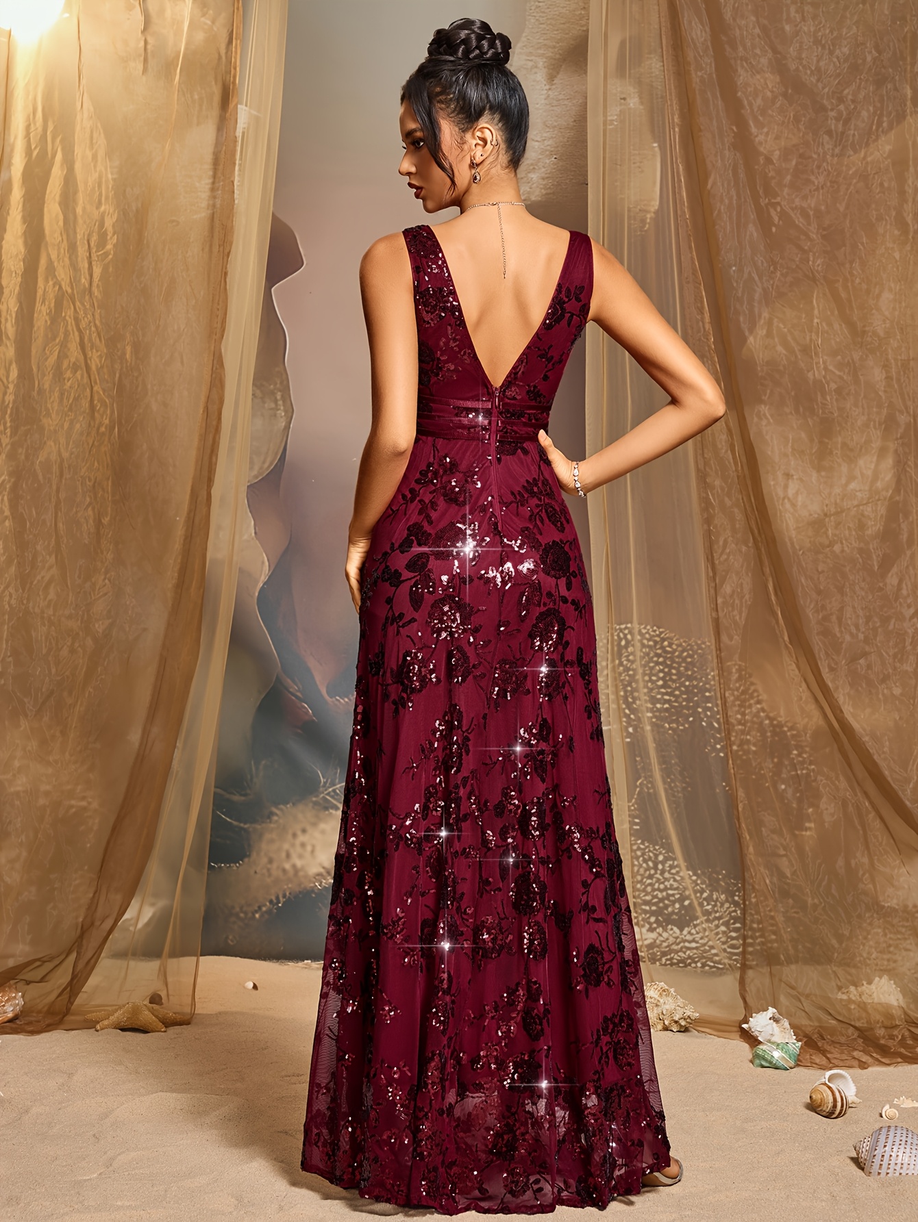 Elegant Wine Red Sequin V-Neck Gown for Women - Waist, Long Evening Dress for Parties, Banquets, and Formal Events, Perfect for Graduations and Cocktail Parties, Elegant Event Attire | Vneck Design | Shimmering Sequins