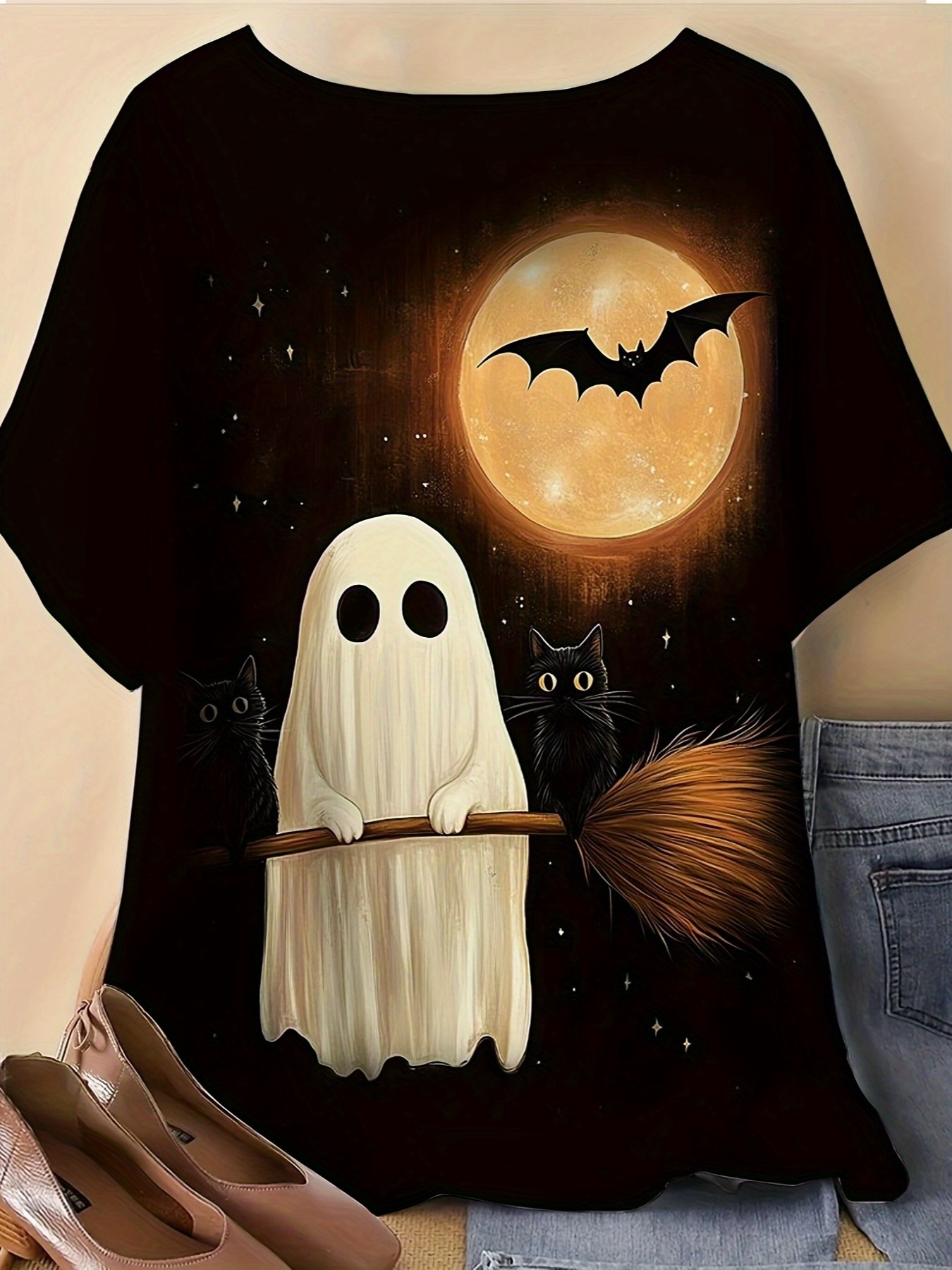 [Halloween Shirts] Plus Size Women's Halloween T-Shirt - Spooky Ghost, Bats & Full Moon Print, Stretchy Round Neck Short Sleeve Top | Casual Summer Outdoor Wear, Elegant & Comfortable Fabric