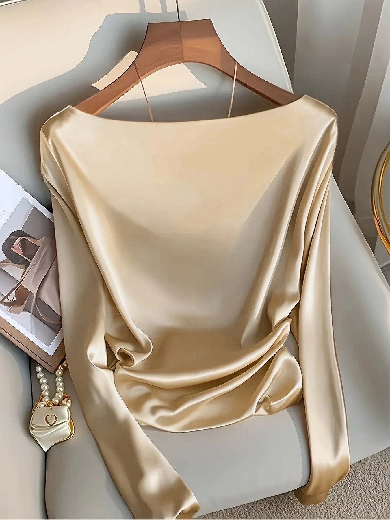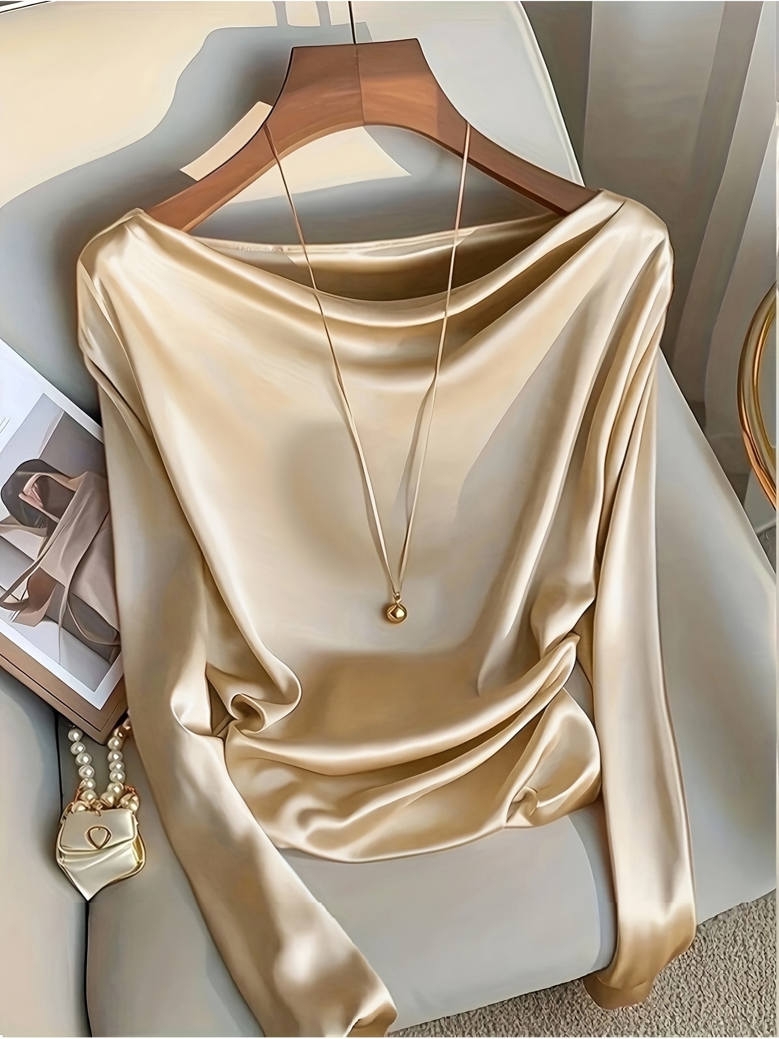 Plus Size - Elegant Plus Size Satin Blouse for Women - Long Sleeve, Off-Shoulder Design, Solid Black, Smooth Polyester Fabric, Perfect for Spring & Fall, Stylish Office Attire, Versatile Blouse | Offshoulder Top | Glossy Texture