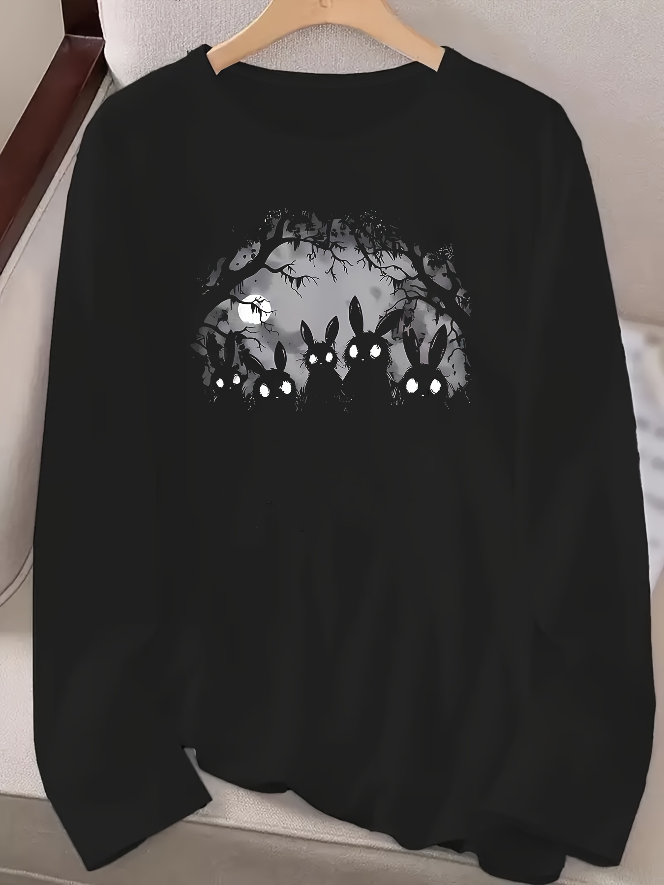 [Plus Size Halloween T-Shirt] Plus Size Women's Halloween Oversized Long Sleeve T-Shirt | Gothic Rabbit Print with Spooky Forest | Black & White Halloween Party Outfit | Casual Everyday Fall/Winter Top | Machine Washable Year-Round Layering Essential