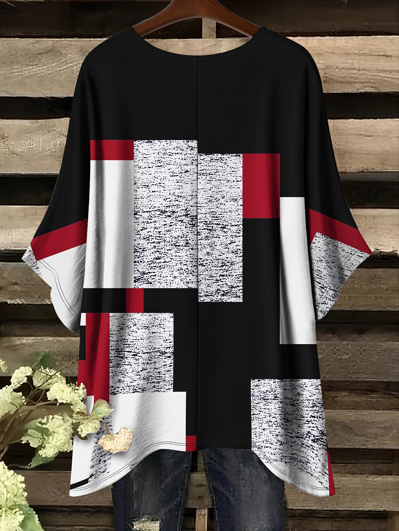 Plus Size - Women'S Plus Size Geometric Print T-Shirt - Casual Crew Neck, Short Sleeve, Asymmetrical Hem, Black & White Design with Red Accents, Comfortable Summer Top, Ladies T Shirts